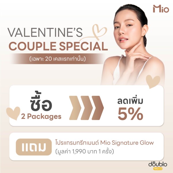 โปรโมชั่น Couple Special ซื้อ 2 แพ็กเกจ รับส่วนลดเพิ่ม 5% พร้อมแถม Mio Signature Glow ที่ Mio Clinic
