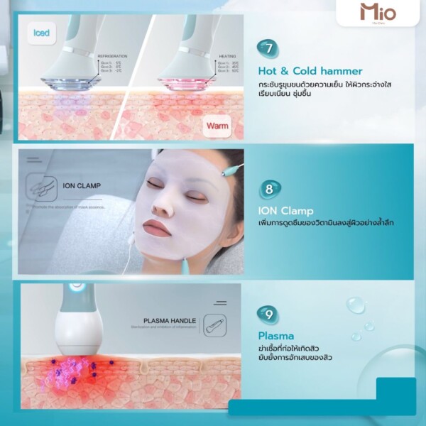 • การใช้ประจุไฟฟ้า (Ionization): อุปกรณ์ ION Clamp จะปล่อยกระแสไฟฟ้าอ่อนๆ ที่มีประจุ (ไอออน) ในระดับต่ำลงสู่ผิวหนัง กระแสไฟฟ้านี้จะช่วยผลักดันโมเลกุลของสารบำรุงในมาสก์ให้สามารถซึมซาบเข้าสู่ผิวได้ลึกและมีประสิทธิภาพมากยิ่งขึ้น