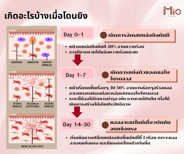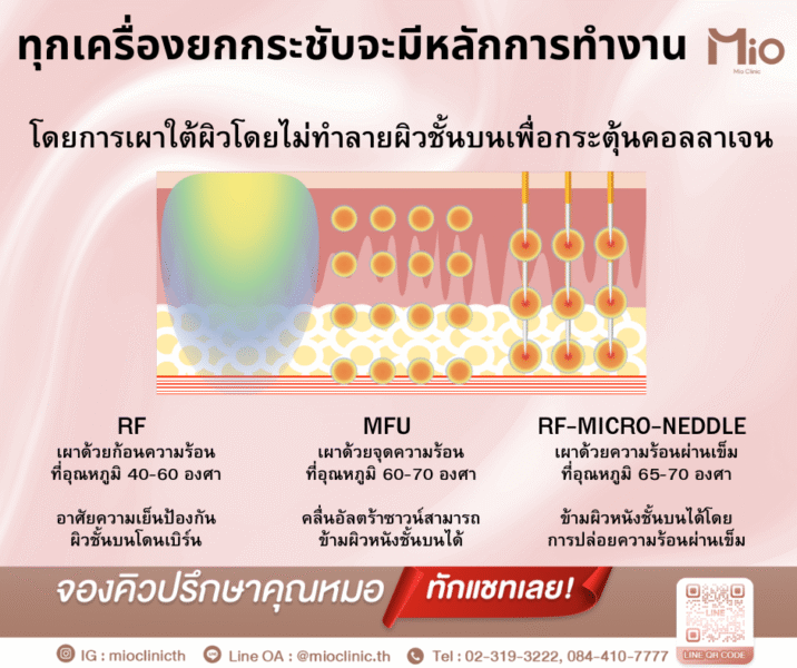 - Microfocused Ultrasound (MFU): MFU ส่งพลังงานอัลตร้าซาวด์แบบเฉพาะเจาะจงไปยังชั้นผิวที่กำหนดไว้ พลังงานนี้จะสร้างความร้อนอย่างแม่นยำ ทำให้เกิดการกระตุ้นการสร้างคอลลาเจนใหม่ ซึ่งเป็นโปรตีนสำคัญที่ช่วยให้ผิวยกกระชับและเต่งตึง